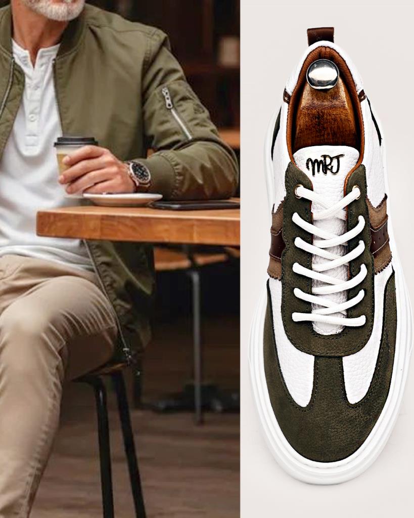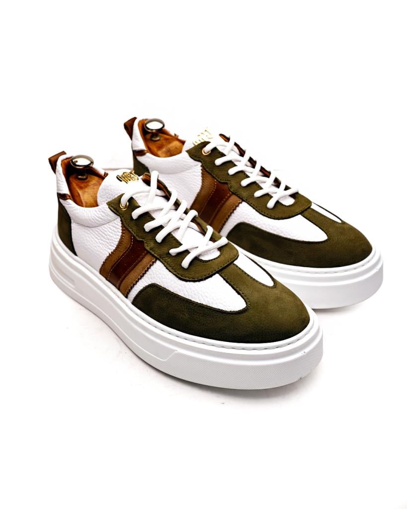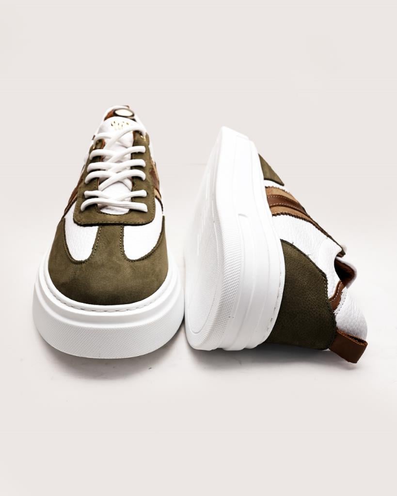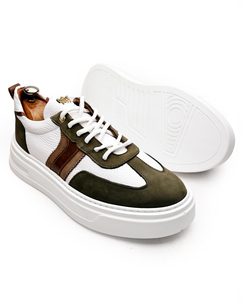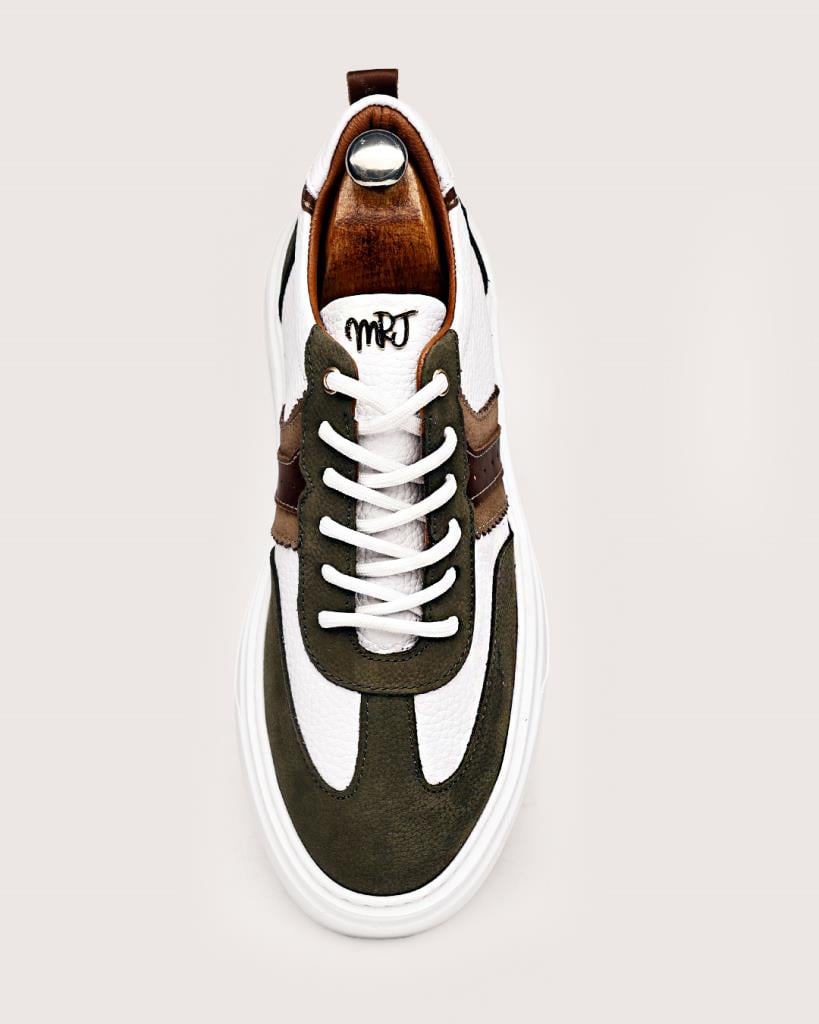 Bu özel tasarım sneaker, şehirli erkeğin stilini tamamlamak için üretildi. Ordu yeşili süet detayları, beyaz dokulu deri yüzeyle mükemmel bir kontrast yaratırken; kahverengi deri şeritler, ayakkabıya sofistike bir hava katıyor. Kalın ve dayanıklı tabanı sayesinde hem konforlu hem de dikkat çekici bir duruş sergiliyor.